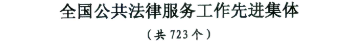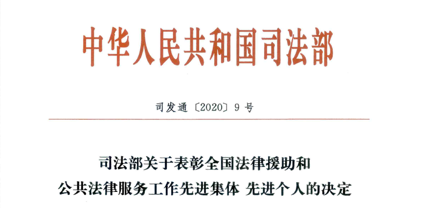 2020年1月20日,司法部颁布了《司法部关于表彰全国法律援助和公共法律服务工作先进集体 先进个人的决定》(司发通[2020]9号),通报表彰了全国270个集体为“全国法律援助先进集体”、424名同志为“全国法律援助先进个人”、723个集体为“全国公共法律服务工作先进集体”和964名同志为“全国公共法律服务工作先进个人”。