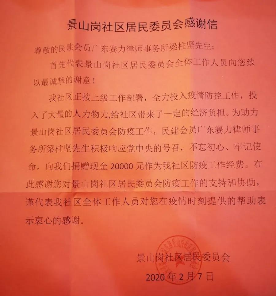民建作为参政议政和社会服务的中坚力量,2020年2月7日,梁柱坚律师响应民建市委会号召,为支持基层社区的防疫工作,向端州区景山岗社区居委会捐资20000元,缓解了社区抗疫工作资金方面的燃眉之急,社区发来了热情洋溢的感谢信,对民建会员的无私奉献表示衷心的感谢。同时,梁律师也在民建机关二支部中发动会员们积极捐款,让抗疫的爱心闪耀了民建的风采。