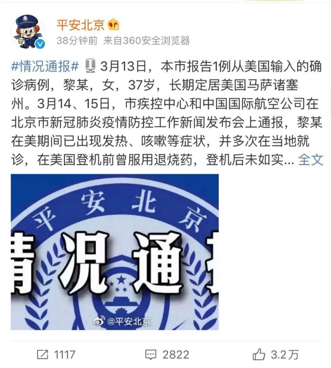 据“平安北京”通报,2020年3月13日,北京市报告1例从美国输入的确诊病例,黎某,女,37岁,长期定居美国马萨诸塞州。2020年3月14、15日,北京市市疾控中心和中国国际航空公司在北京市新冠肺炎疫情防控工作新闻发布会上通报,黎某在美期间已出现发热、咳嗽等症状,并多次在当地就诊,在美国登机前曾服用退烧药,登机后未如实向乘务人员提供个人健康状况及丈夫、儿子等同行人员情况,给同机人员造成传染风险。接相关线索后,北京警方迅速开展调查取证。经初步工作,顺义公安分局以涉嫌妨害传染病防治罪,已对黎某立案侦查。目前,黎某正在定点医院接受治疗,其丈夫、儿子接受隔离观察。